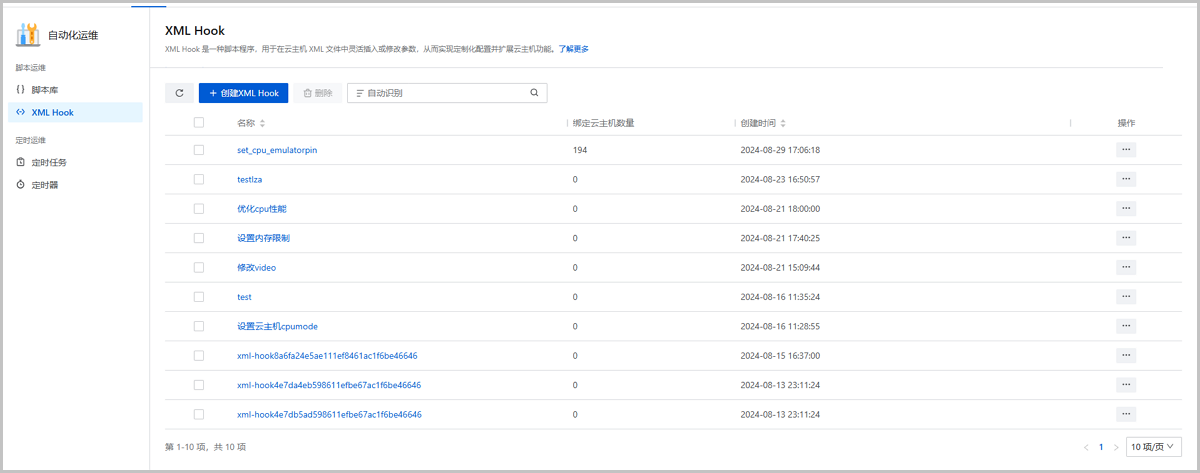 | 删除XML Hook | 将XML Hook删除。 说明: 已绑定云主机的XML Hook不支持删除。如需删除,请先从所有云主机解绑。 |