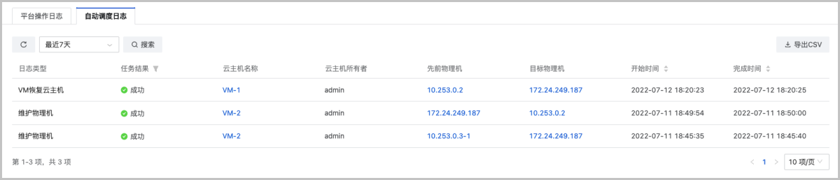 自动调度日志界面显示管理节点主动触发的云主机调度日志,如云主机高可用、维护物理机。支持查看日志类型、任务描述、触发原因、任务结果、云主机名称、云主机所有者、先前物理机、目标物理机、开始时间和完成时间,进一步丰富运维场景,便于审计和追溯。