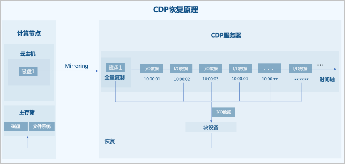对云主机进行CDP之后,CDP服务器首先对云主机数据进行一次全量复制,并持续捕获I/O数据变化,将每次变化的I/O数据打上时间戳并保存下来,从而实现持续数据备份。