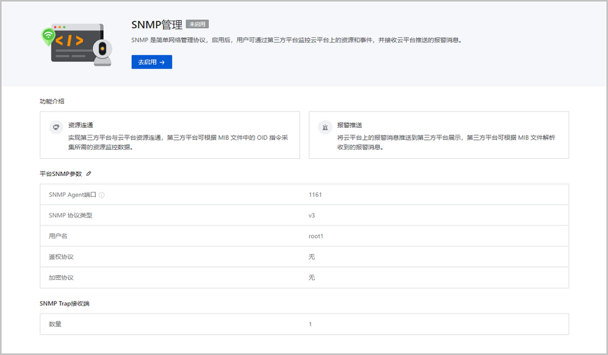 SNMP管理:启用后,用户可通过第三方平台直接监控云平台上的资源和事件,并接收云平台推送的报警消息。